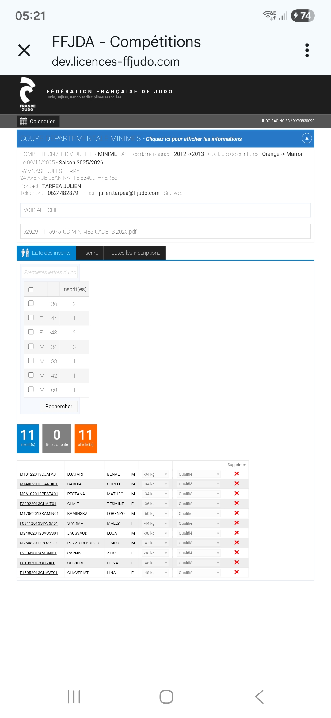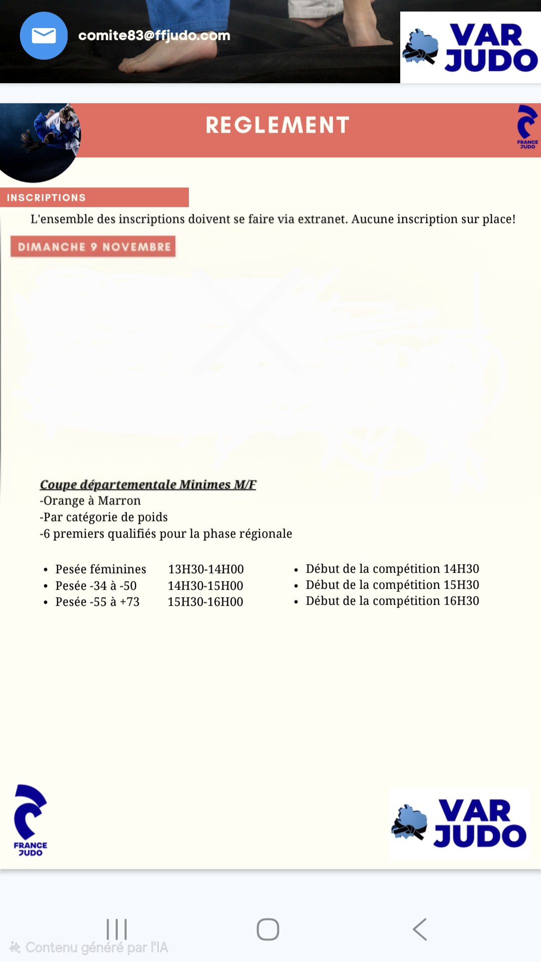 Voici les informations et les horaires de pesée pour la coupe départementale Minimes.